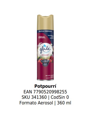 Potpourrí EAN 7790520998255 SKU 341360 | CodSin 0 Formato Aerosol | 360 ml